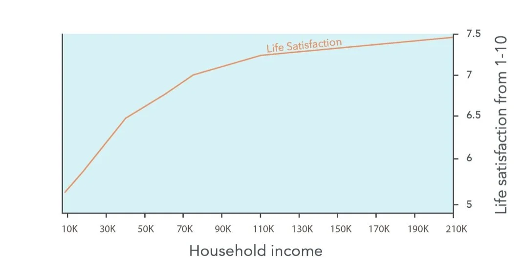 You can see that going from a (pre-tax) income of $40,000 to $80,000 was only associated with an increase in life satisfaction from about 6.5 to 7 out of 10. That’s a lot of extra income for a small increase.